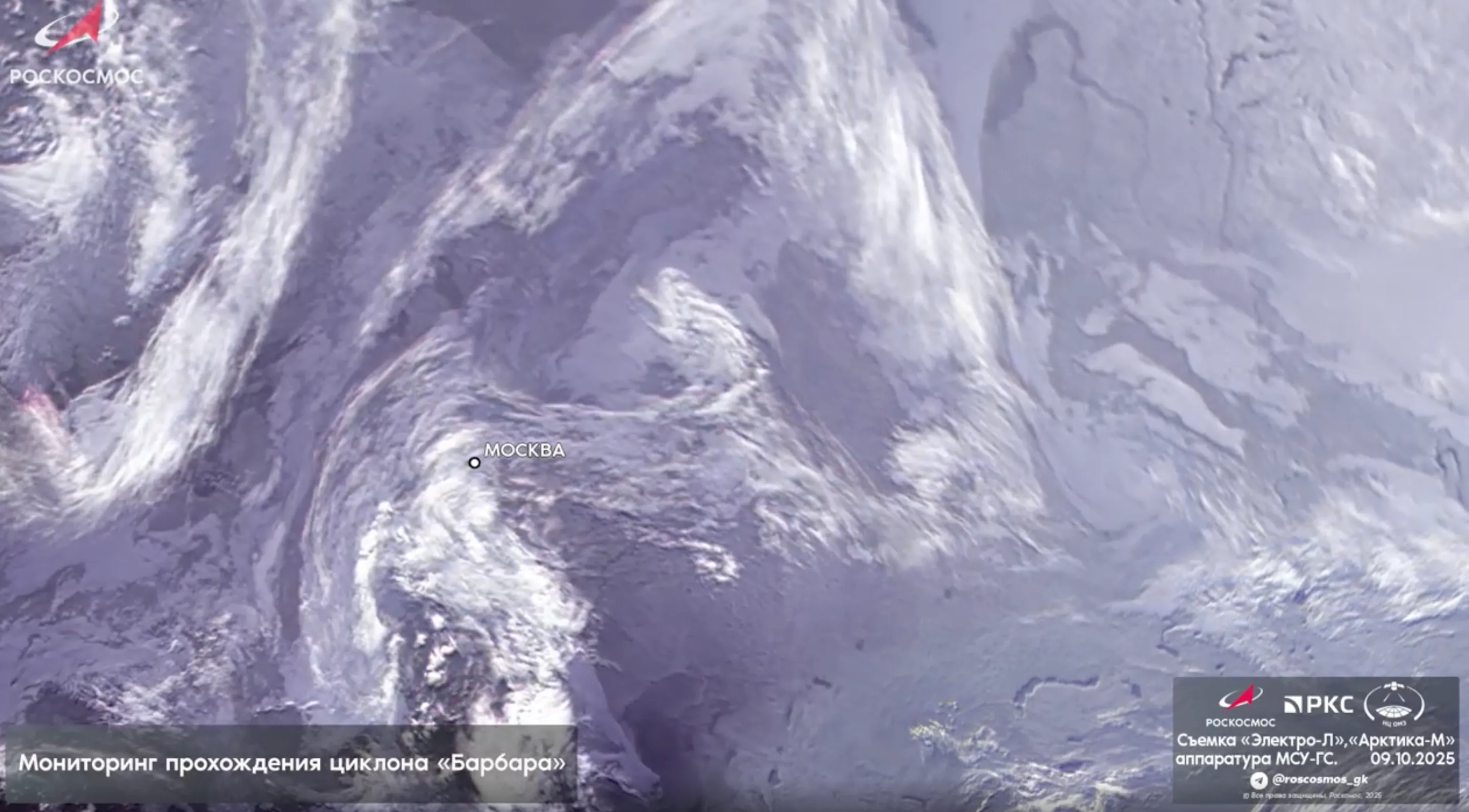 «Роскосмос» показал спутниковое видео циклона «Барбара», который накрыл столицу России. Природная аномалия, которая пришла в европейскую часть страны, принесла с собой похолодание и обильные осадки.