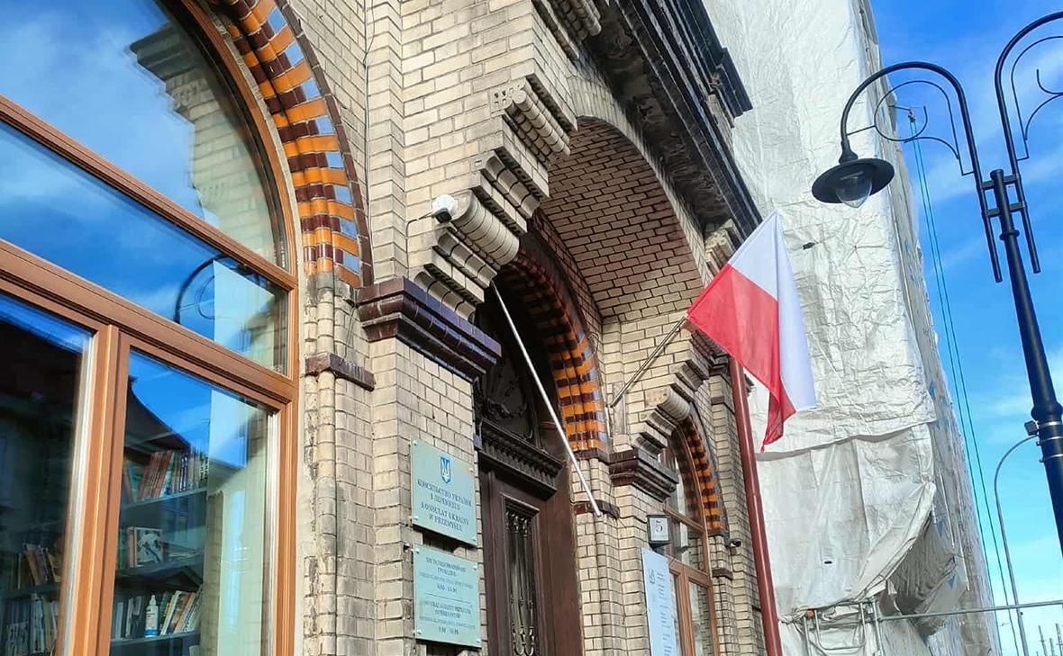 Неизвестные сорвали украинский флаг со здания консульства Украины в польском городе Перемышль.