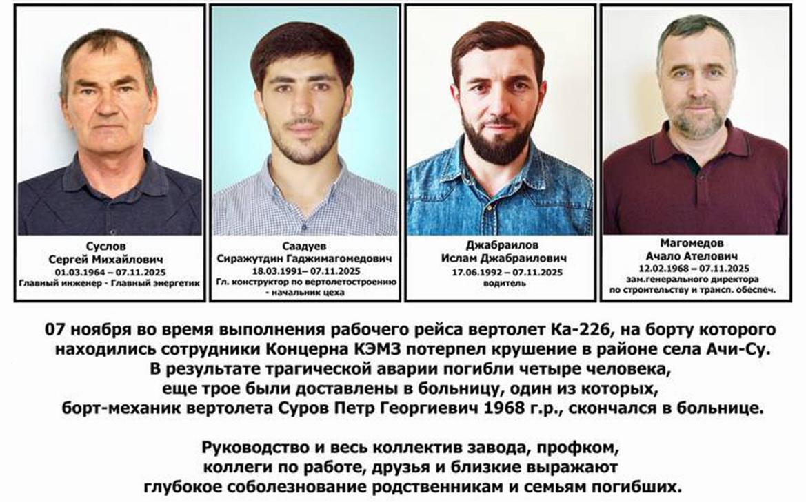 Пять сотрудников «Кизлярского электромеханического завода» погибли в результате катастрофы вертолета Ка-226 в Дагестане.