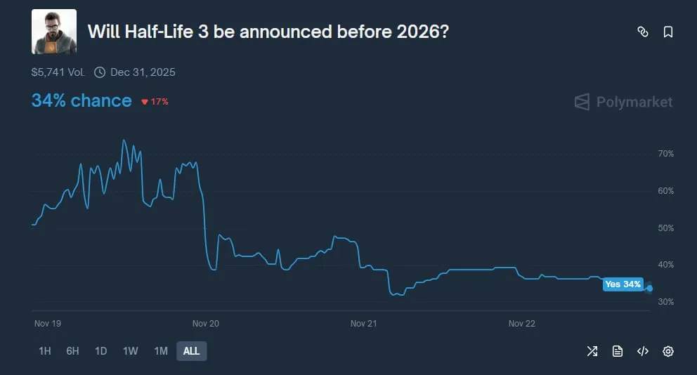 Децентрализованная платформа рынков предсказаний Polymarket представила информацию о Half-Life 3.