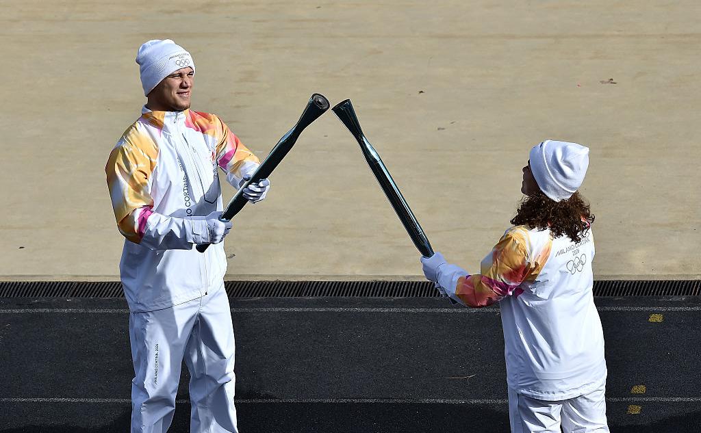 Церемонию в Афинах сократили из-за погодных условий. В ней приняли участие итальянские олимпийские чемпионы — теннисистка Паолини и велогонщик Ганна