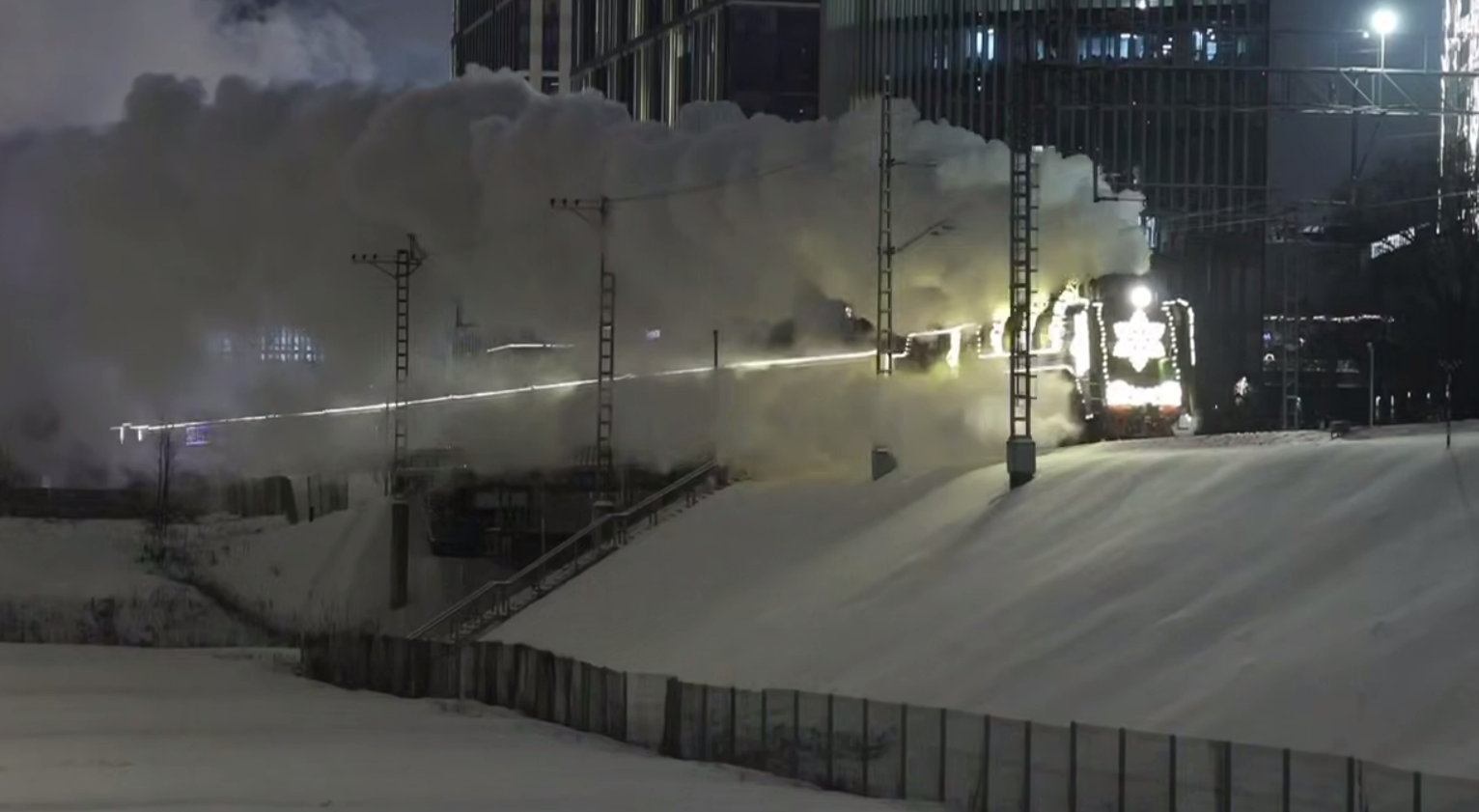 Праздничный поезд Деда Мороза прибыл в Москву в рамках своего масштабного Всероссийского турне. Состав торжественно встречали на Киевском вокзале, где в течение 2 и 3 января будет проходить развлекательная программа для детей и взрослых.