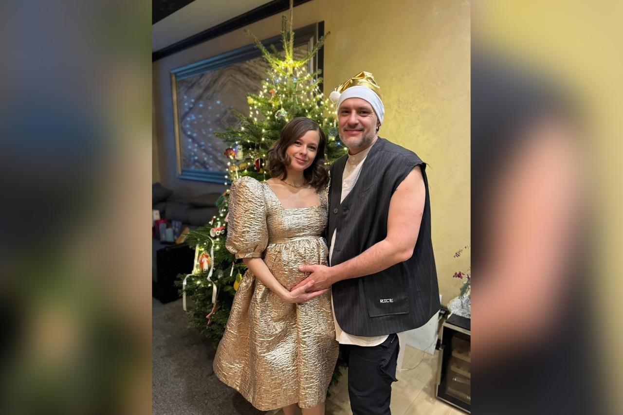 Беременная актриса Катерина Шпица опубликовала рождественский снимок с мужем Русланом Пановым у праздничной ёлки в золотистом платье. Фотография появилась у неё в соцсетях.