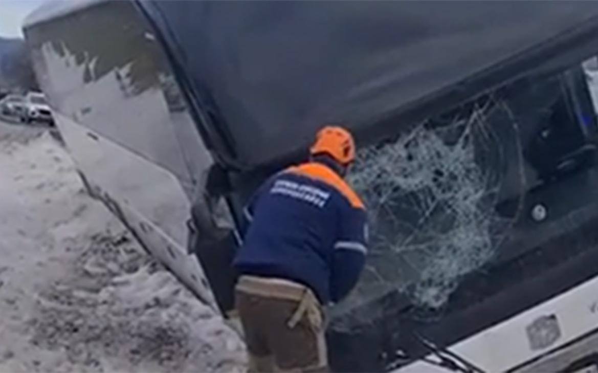 Под Новороссийском в районе хутора Семигорский пассажирский автобус столкнулся с легковым автомобилем, после чего съехал в кювет.