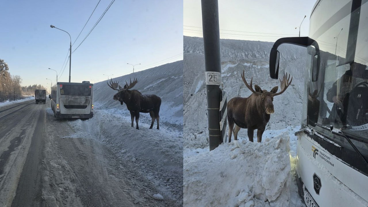 В Подмосковье лось терпеливо ждал автобус на остановке и попытался прокатиться