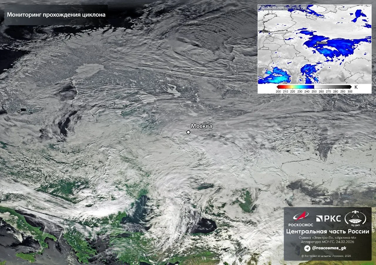 Спутники «Роскосмоса» запечатлели снежный циклон, надвигающийся на Москву