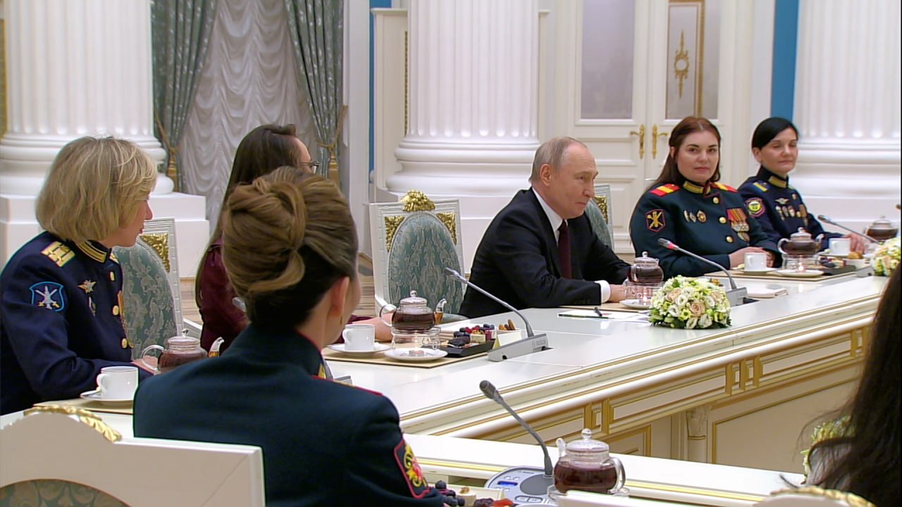 Владимир Путин в преддверии Международного женского дня принял в Сенатском дворце Кремля представительниц разных профессий. Как анонсировал пресс-секретарь президента России Дмитрий Песков, с главой государства пообщались военнослужащие, конструкторы, врачи, добровольцы, творческая интеллигенция и даже военные корреспонденты.