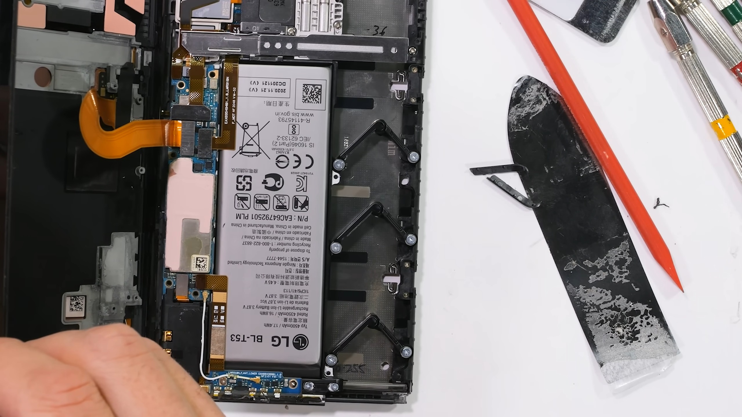 Конструкция LG Rollable очень необычна. Уже первый этап разборки показывает, что внутренняя часть гибкого экрана в той части, где он скручивается и раскручивается, представляет собой нечто вроде гусеничной ленты, которая используется посредством специального зубчатого механизма.