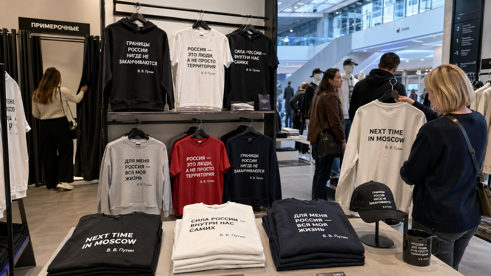 В Национальном центре «Россия» обновили зону мерча с изделиями, на которых размещены цитаты президента РФ Владимира Путина. Пространство сделали светлее и удобнее для посетителей. В зоне появилась примерочная, а ассортимент и размерный ряд расширили.