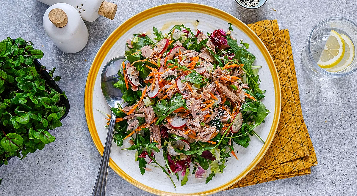 На приготовление азиатского салата из тунца потребуется всего 20 минут — меньше, чем, например, на подачу «Мимозы». Нет, мы не будем пытаться сравнивать блюда между собой, но обратите внимание, как нарядно и красиво могут смотреться закуски с консервированной рыбой. И при этом легко и быстро готовиться. Азиатский салат с тунцом вполне достоин однажды оказаться на вашем праздничном столе рядом с застольной классикой. И это довольно легкая и свежая закуска, в ней много зелени, овощей, пряностей, что значит одно — для других тоже сохранится аппетит.